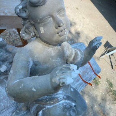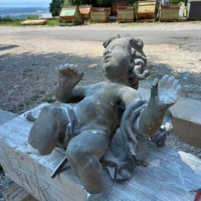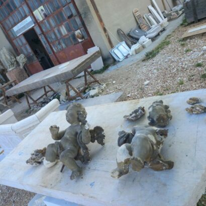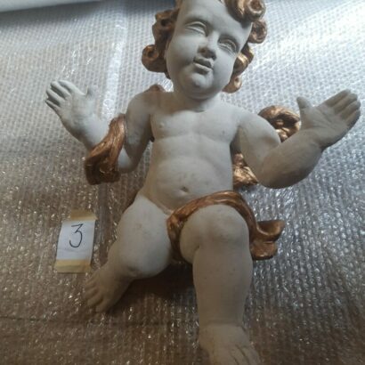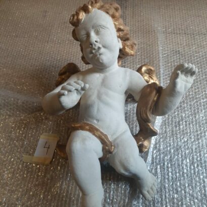 Restauro di una coppia di angioletti realizzati in “Piera Galina” di Verona: sono state assemblate la testa e le parti rotte del corpo. Si è proceduto alla ricostruzione delle dita delle mani e alla successiva colorazione, con l’applicazione di bianco e dettagli in oro, per riportare le figure alla loro bellezza originale.