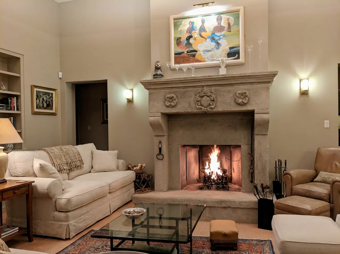 Camino in tufo grigio lavorato a mano, impreziosito da uno stemma centrale scolpito e motivi decorativi laterali, dal carattere elegante e senza tempo.